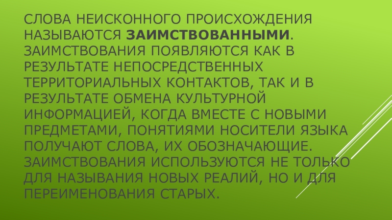 Слайд 21Слова неисконного происхождения называются заимствованными. Заимствования появляются как в результате непосредственных территориальных