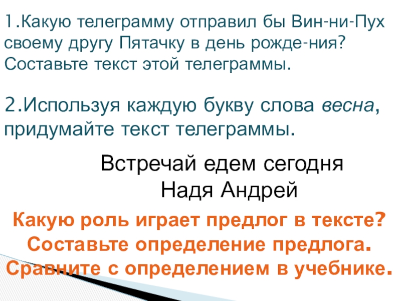 2.Используя каждую букву слова весна, придумайте текст телеграммы.