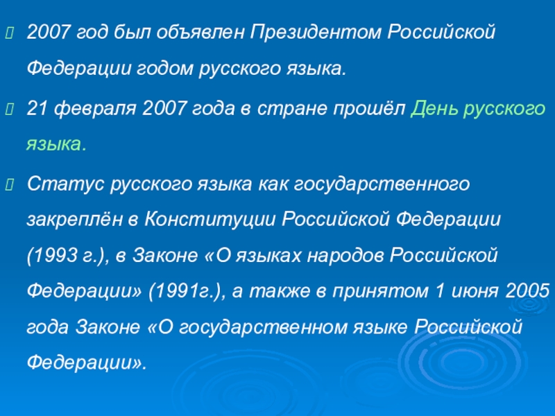 Слайд 62007 год был объявлен Президентом Российской Федерации годом русского языка.