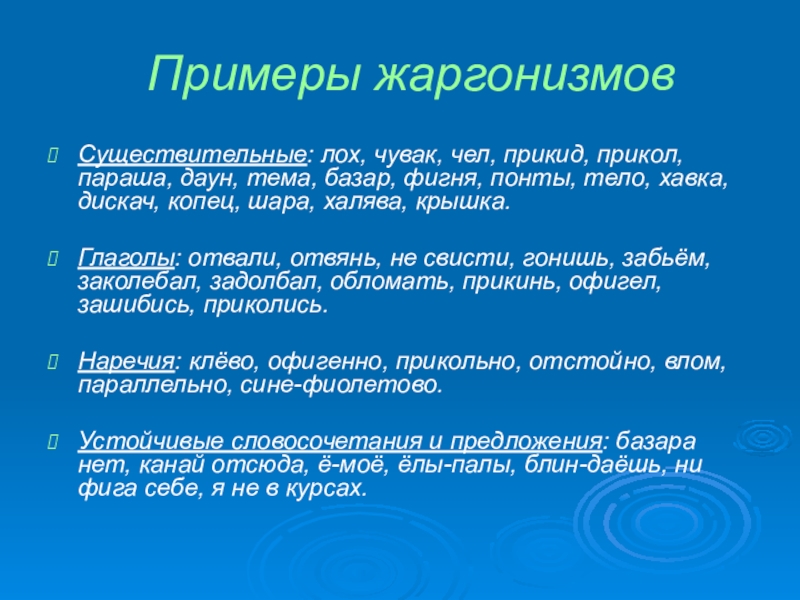 Слайд 15Примеры жаргонизмов