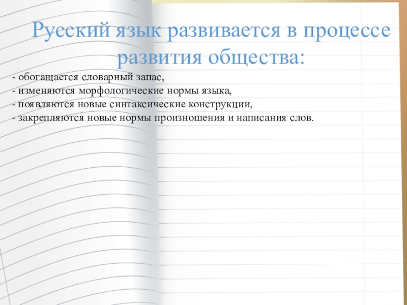 Русский язык развивается в процессе развития общества:- обогащается словарный запас,- изменяются морфологические нормы языка,- появляются новые синтаксические