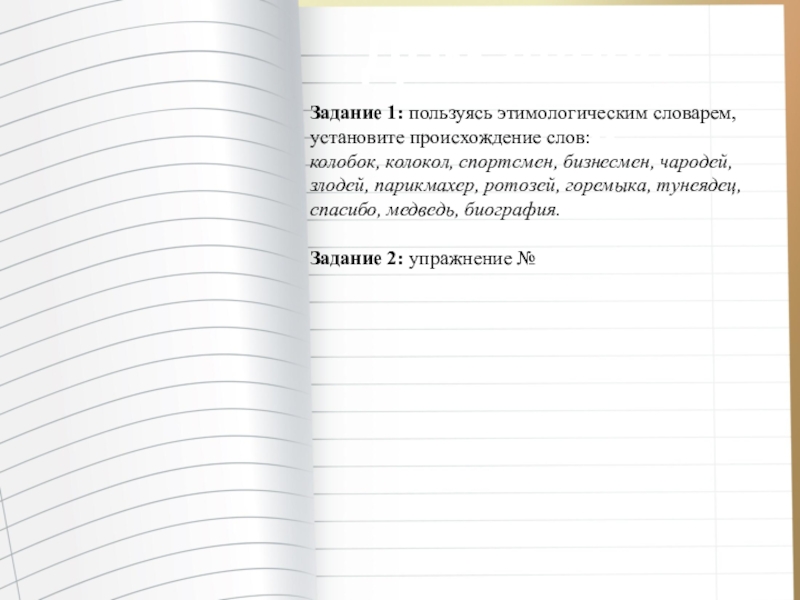 Домашнее заданиеЗадание 1: пользуясь этимологическим словарем, установите происхождение слов:колобок, колокол, спортсмен, бизнесмен, чародей, злодей, парикмахер, ротозей, горемыка, тунеядец,