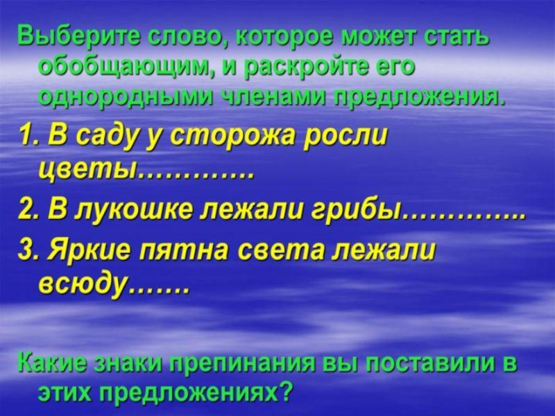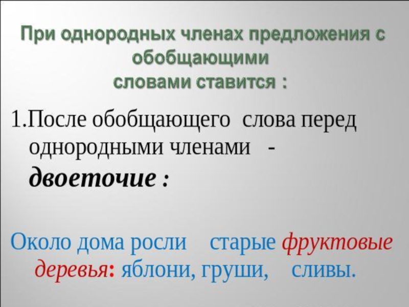 Обобщающее слово — это слово или сочетание слов, которое является общим обозначением для однородных членов предложения.