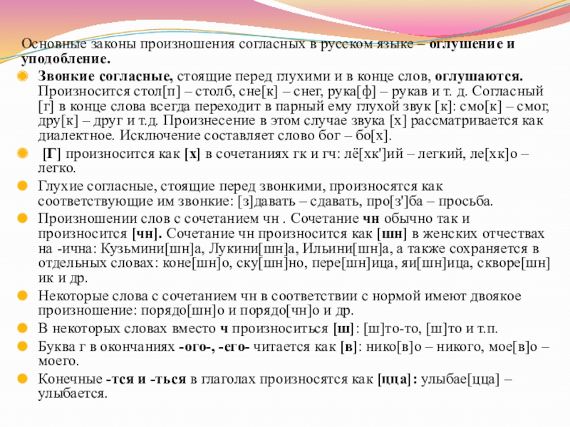 Слайд 9Основные законы произношения согласных в русском языке – оглушение и уподобление.