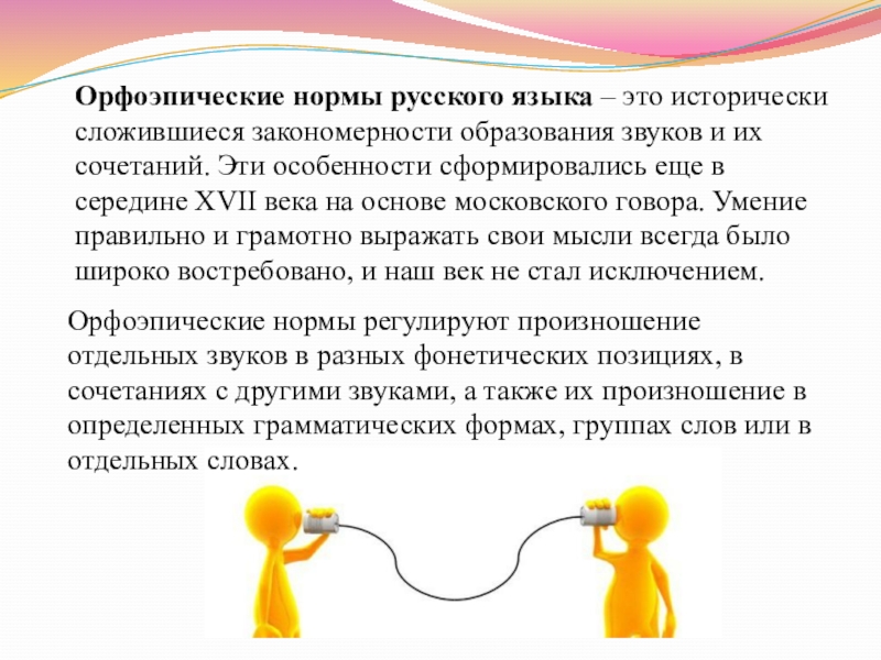 Орфоэпические нормы русского языка – это исторически сложившиеся закономерности образования звуков и их сочетаний. Эти особенности сформировались еще в середине XVII века на основе московского говора. Умение правильно и грамотно выражать свои мысли всегда было широко востребовано, и наш век не стал исключением.