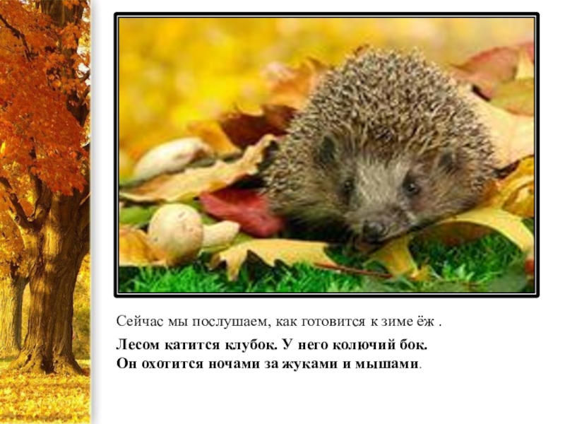 Сейчас мы послушаем, как готовится к зиме ёж .Лесом катится клубок. У него колючий бок. Он охотится