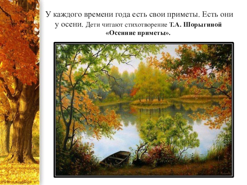 У каждого времени года есть свои приметы. Есть они у осени. Дети читают стихотворение Т.А. Шорыгиной «Осенние