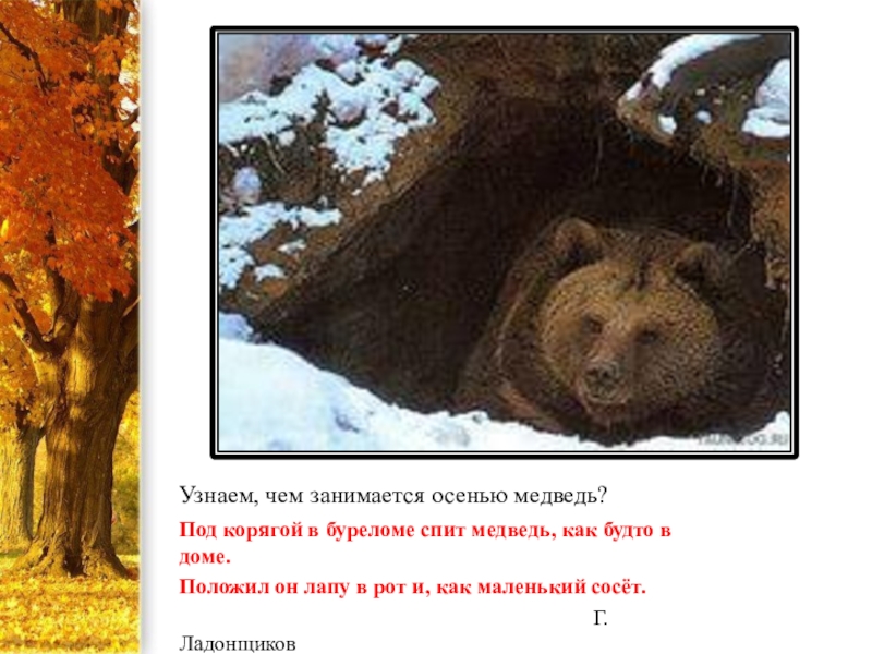 Слайд 16Узнаем, чем занимается осенью медведь?