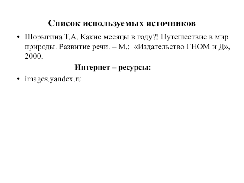 Список используемых источников Шорыгина Т.А. Какие месяцы в году?! Путешествие в мир природы. Развитие речи. – М.:
