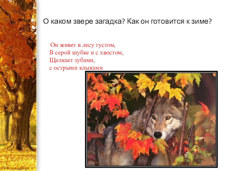 Слайд 18О каком звере загадка? Как он готовится к зиме?