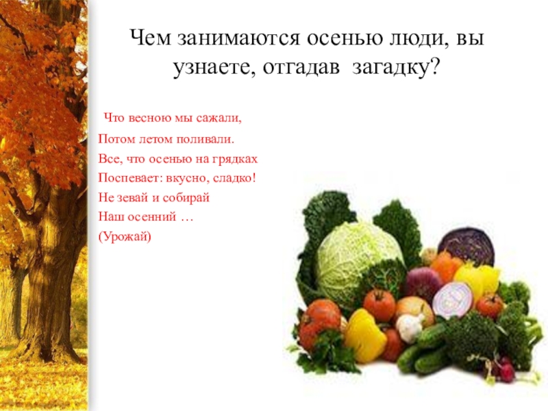 Слайд 7Чем занимаются осенью люди, вы узнаете, отгадав загадку?