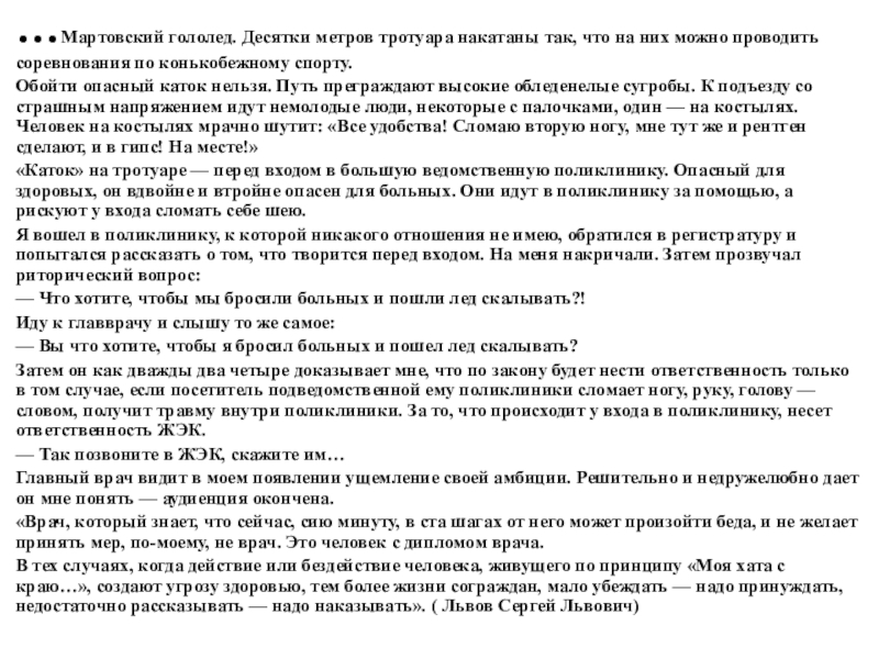Затем он как дважды два четыре доказывает мне, что по закону будет нести ответственность только в том случае, если посетитель подведомственной ему поликлиники сломает ногу, руку, голову — словом, получит травму внутри поликлиники. За то, что происходит у входа в поликлинику, несет ответственность ЖЭК.