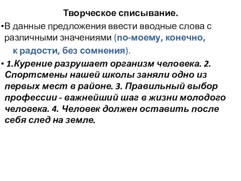 1.Курение разрушает организм человека. 2. Спортсмены нашей школы заняли одно из первых мест в районе. 3. Правильный выбор профессии - важнейший шаг в жизни молодого человека. 4. Человек должен оставить после себя след на земле.
