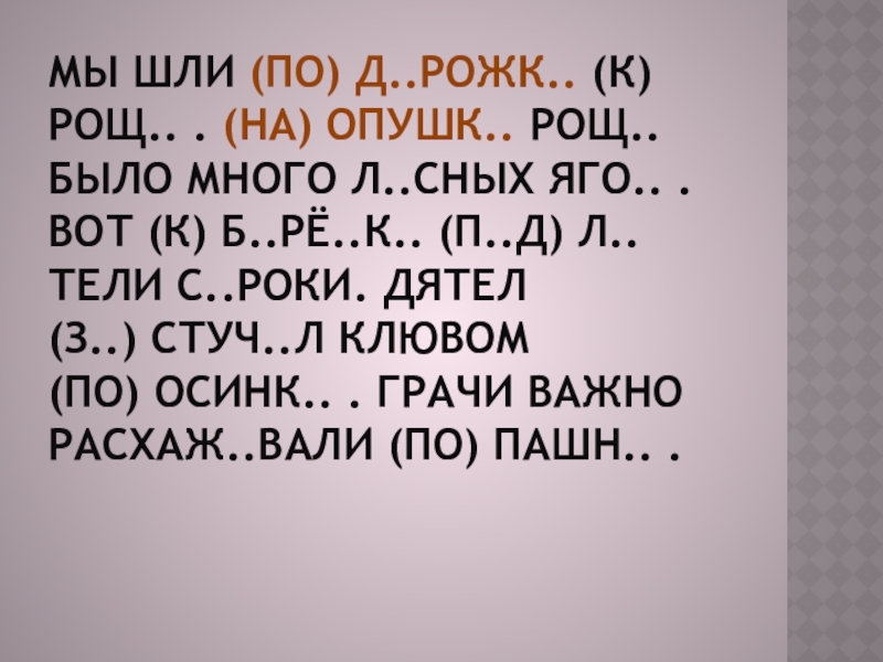 Слайд 21Мы шли (по) д..рожк.. (к) рощ.. . (На) опушк.. рощ.. было много л..сных яго.. .