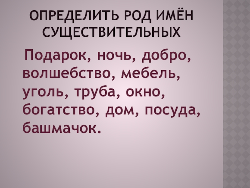 Определить род имён существительных Подарок, ночь, добро, волшебство, мебель, уголь, труба, окно, богатство, дом, посуда, башмачок.