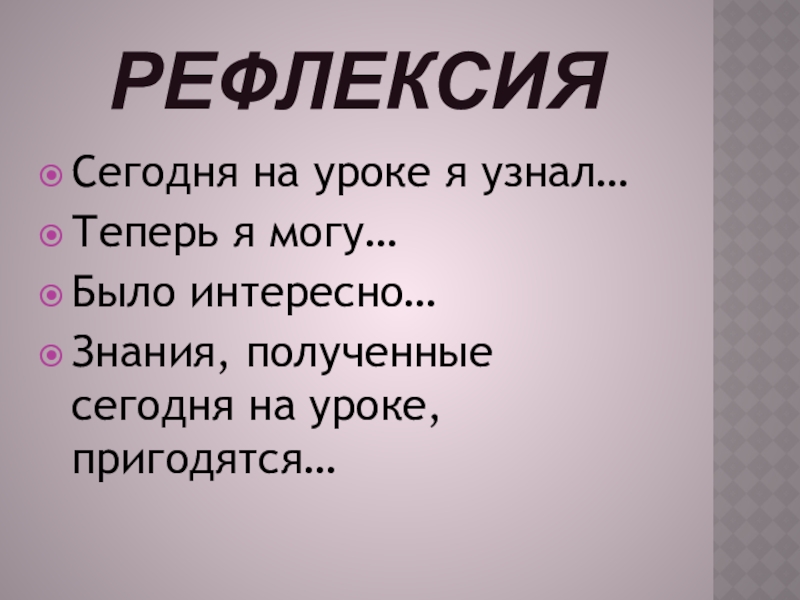 РефлексияСегодня на уроке я узнал…Теперь я могу…Было интересно…Знания, полученные сегодня на уроке, пригодятся…