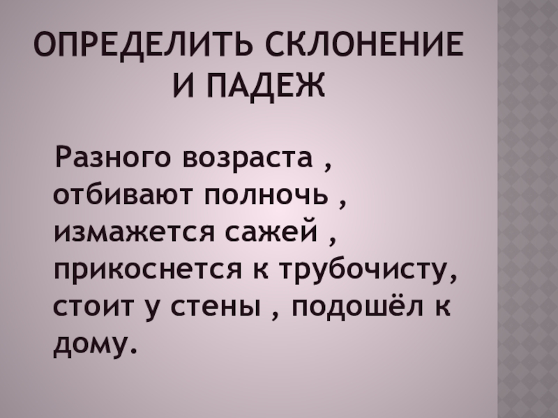 Определить склонение и падеж Разного возраста , отбивают полночь , измажется сажей , прикоснется к трубочисту, стоит
