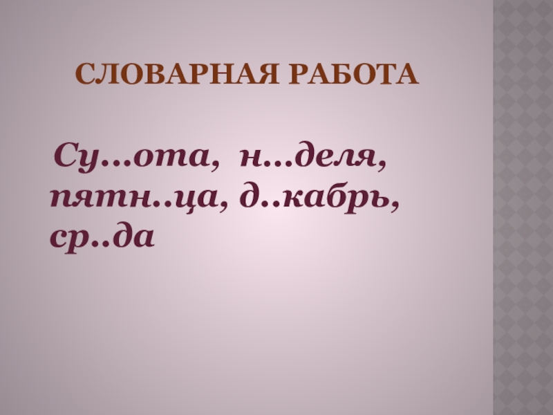 Словарная работа Су...ота, н…деля, пятн..ца, д..кабрь, ср..да