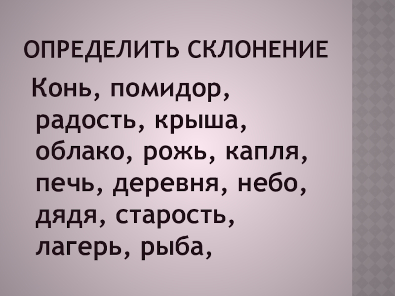 Определить склонение Конь, помидор, радость, крыша, облако, рожь, капля, печь, деревня, небо, дядя, старость, лагерь, рыба,