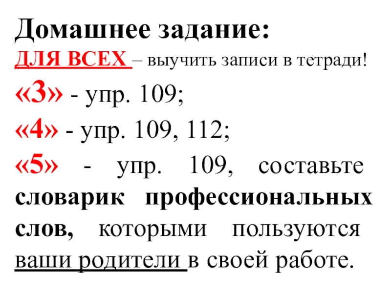 «5» - упр. 109, составьте словарик профессиональных слов, которыми пользуются ваши родители в своей работе.