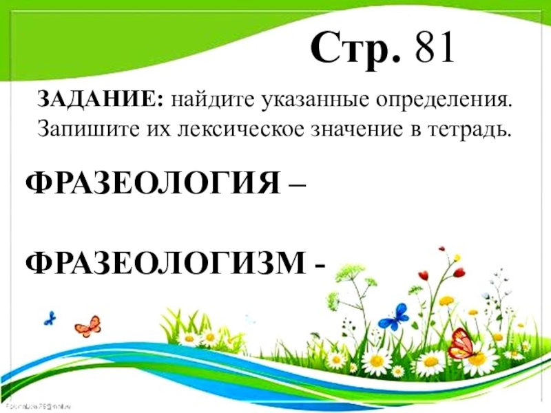 Слайд 34ЗАДАНИЕ: найдите указанные определения. Запишите их лексическое значение в тетрадь.
