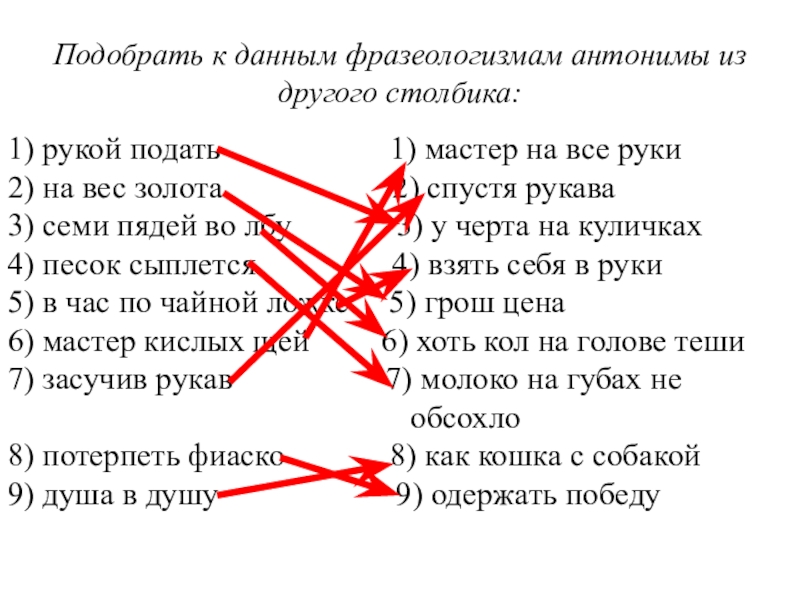 Слайд 39Подобрать к данным фразеологизмам антонимы из другого столбика: