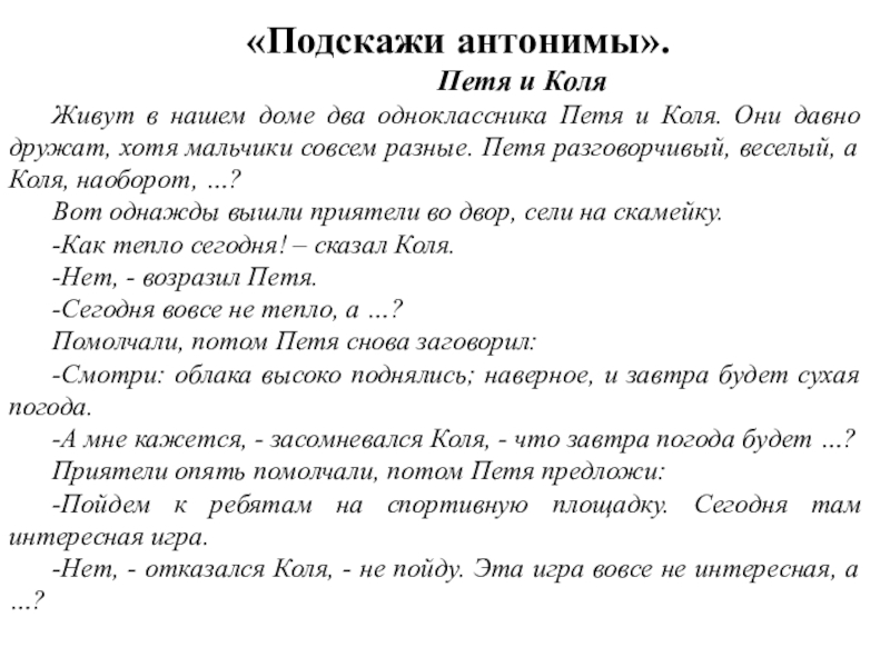 Живут в нашем доме два одноклассника Петя и Коля. Они давно дружат, хотя мальчики совсем разные. Петя разговорчивый, веселый, а Коля, наоборот, …?