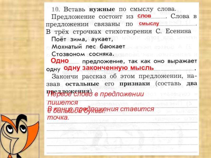 словсмыслуОдноодну законченную мысльПервое слово в предложении пишется с большой буквы.В конце предложения ставится точка.