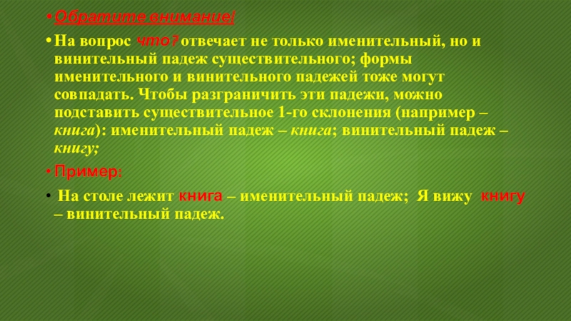 Обратите внимание!На вопрос что? отвечает не только именительный, но и винительный падеж существительного; формы именительного и винительного