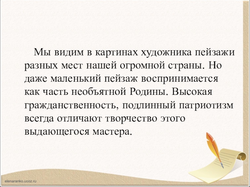 Но даже маленький пейзаж воспринимается как часть необъятной Родины. Высокая гражданственность, подлинный патриотизм всегда отличают творчество этого выдающегося мастера.