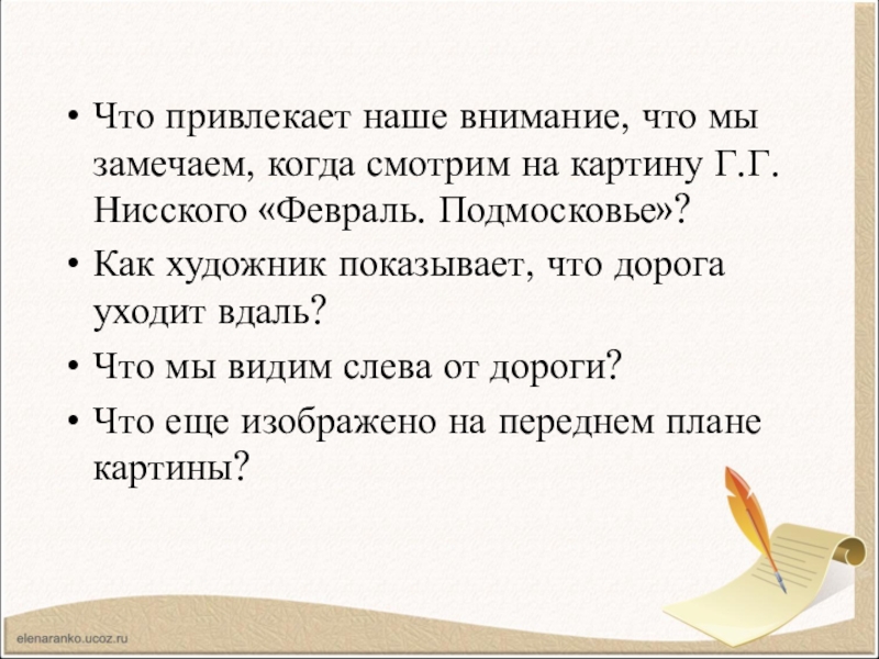 Что привлекает наше внимание, что мы замечаем, когда смотрим на картину Г.Г.Нисского «Февраль. Подмосковье»?Как художник показывает, что
