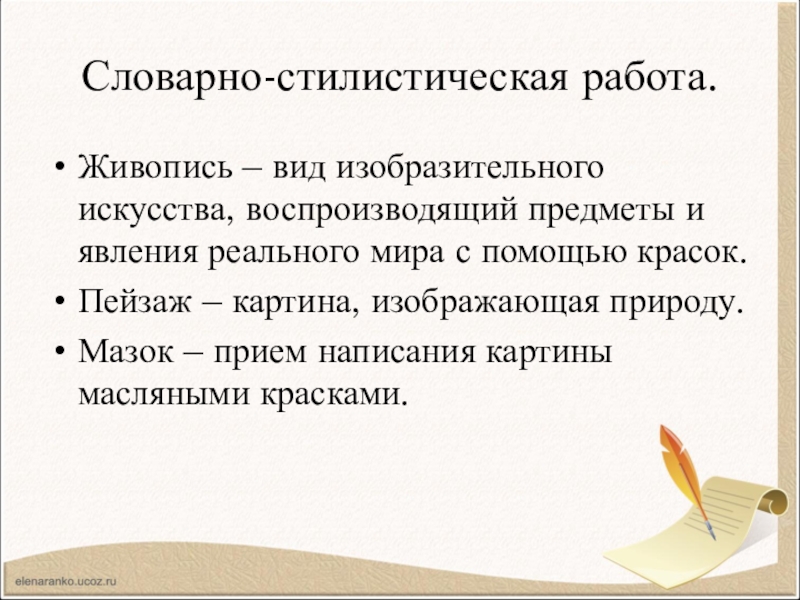 Словарно-стилистическая работа.Живопись – вид изобразительного искусства, воспроизводящий предметы и явления реального мира с помощью красок.Пейзаж – картина,