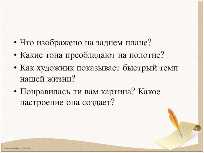 Что изображено на заднем плане?Какие тона преобладают на полотне?Как художник показывает быстрый темп нашей жизни?Понравилась ли вам