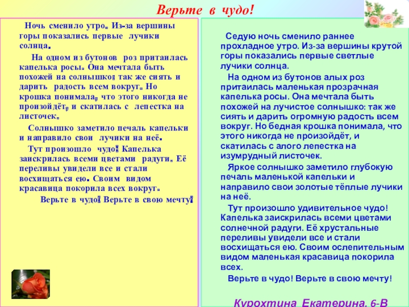 На одном из бутонов алых роз притаилась маленькая прозрачная капелька росы. Она мечтала быть похожей на лучистое солнышко: так же сиять и дарить огромную радость всем вокруг. Но бедная крошка понимала, что этого никогда не произойдёт, и скатилась с алого лепестка на изумрудный листочек.