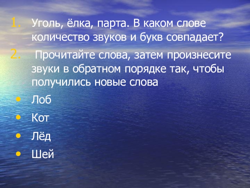 Слайд 21Уголь, ёлка, парта. В каком слове количество звуков и букв совпадает?