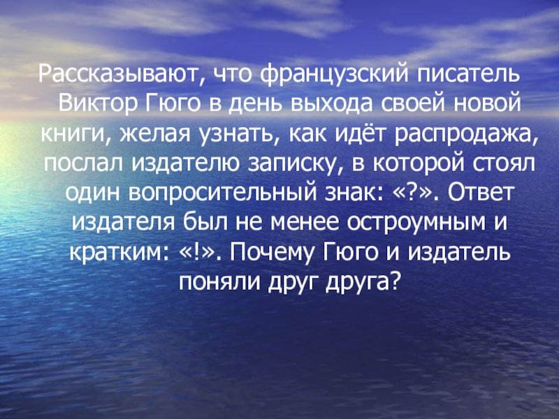 книги, желая узнать, как идёт распродажа, послал издателю записку, в которой стоял один вопросительный знак: «?». Ответ издателя был не менее остроумным и кратким: «!». Почему Гюго и издатель поняли друг друга?