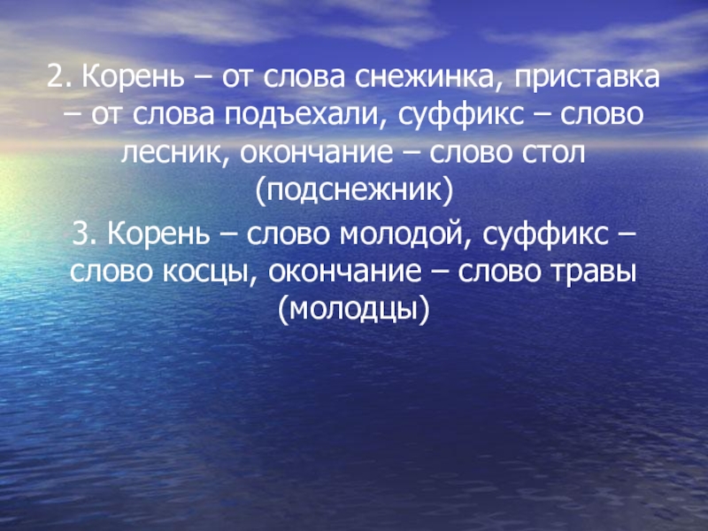 Слайд 282. Корень – от слова снежинка, приставка – от слова подъехали, суффикс