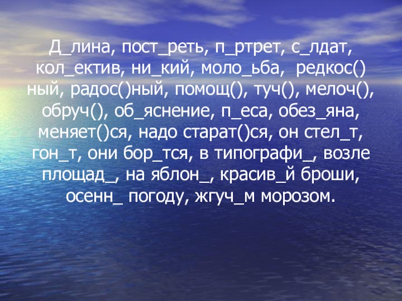 Слайд 15Д_лина, пост_реть, п_ртрет, с_лдат, кол_ектив, ни_кий, моло_ьба, редкос()ный, радос()ный, помощ(), туч(),