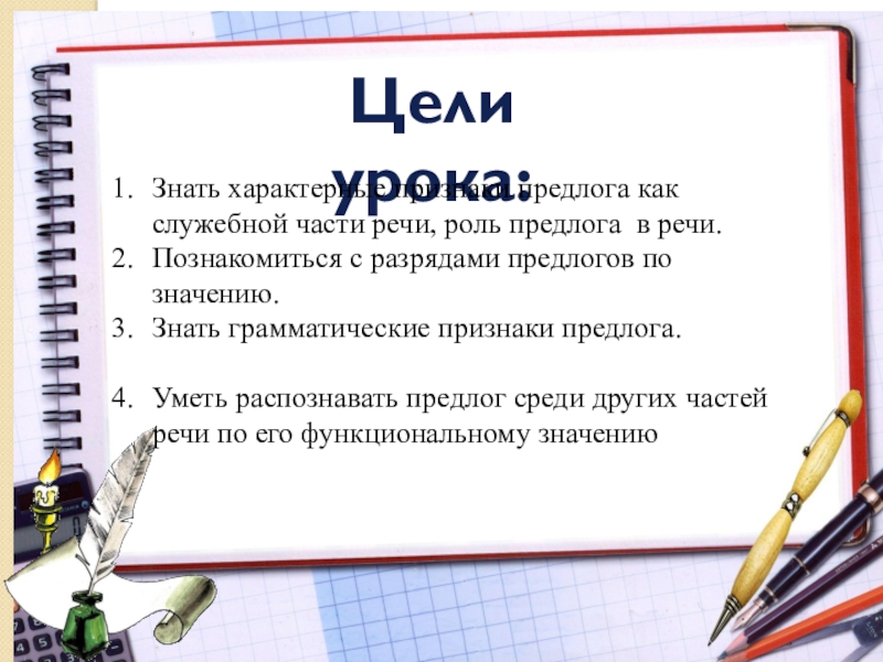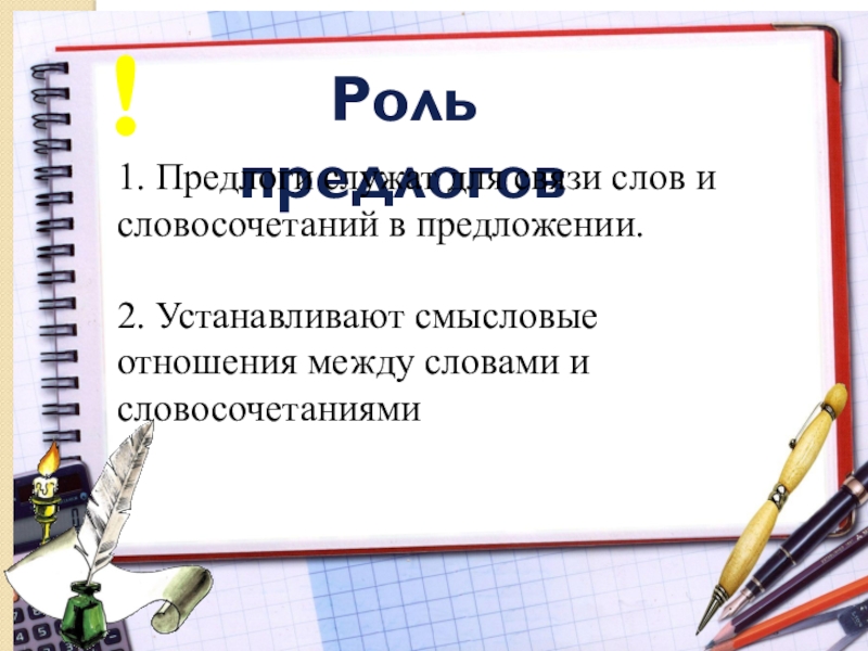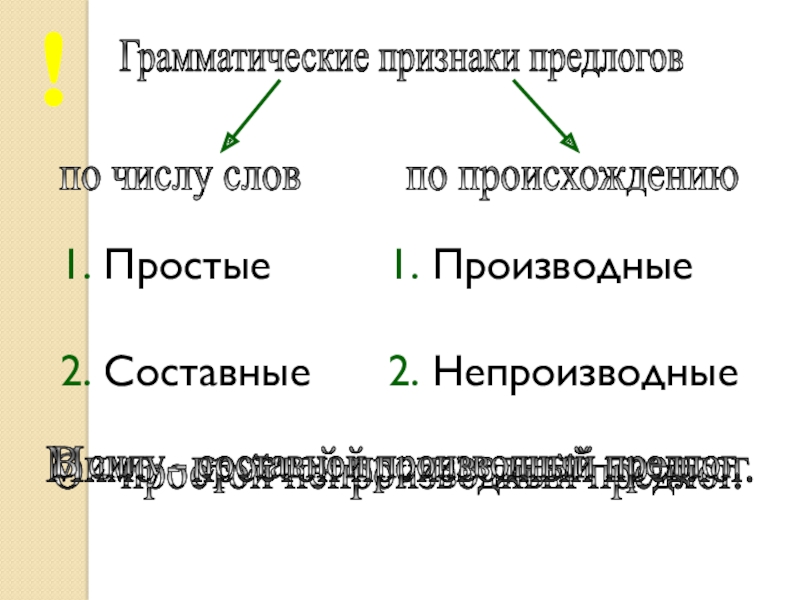Предлоги – это служебная часть речи, которая служит для связи слов и словосочетаний в предложении, предлоги устанавливают смысловые отношения между словами и словосочетаниями. По грамматическим признакам предлоги бывают простые и составные, производные и непроизводные.