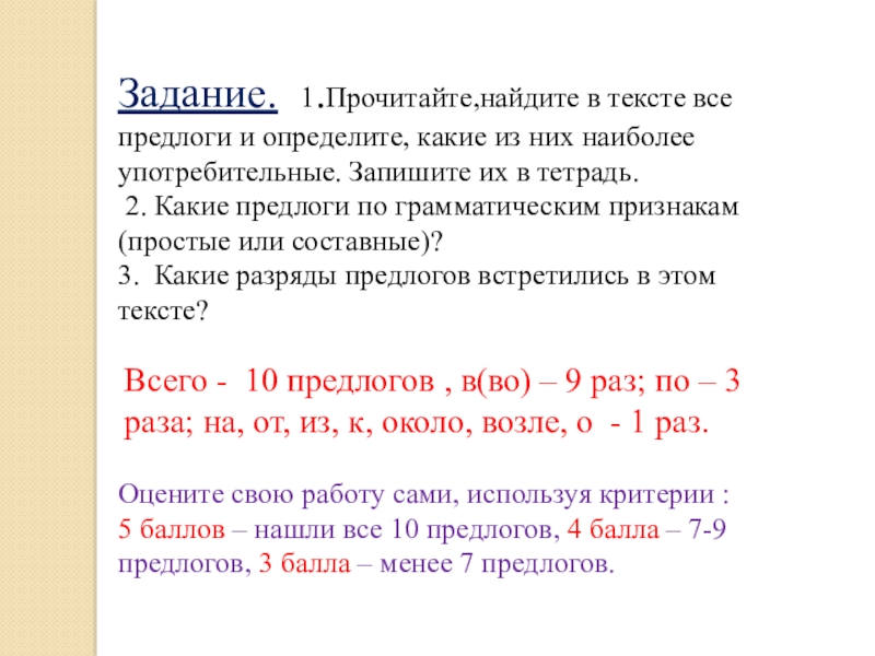 5 баллов – нашли все 10 предлогов, 4 балла – 7-9 предлогов, 3 балла – менее 7 предлогов.