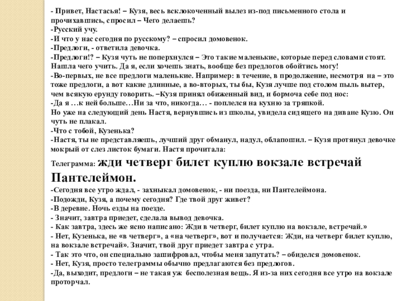 Слайд 4- Привет, Настасья! – Кузя, весь всклокоченный вылез из-под письменного стола