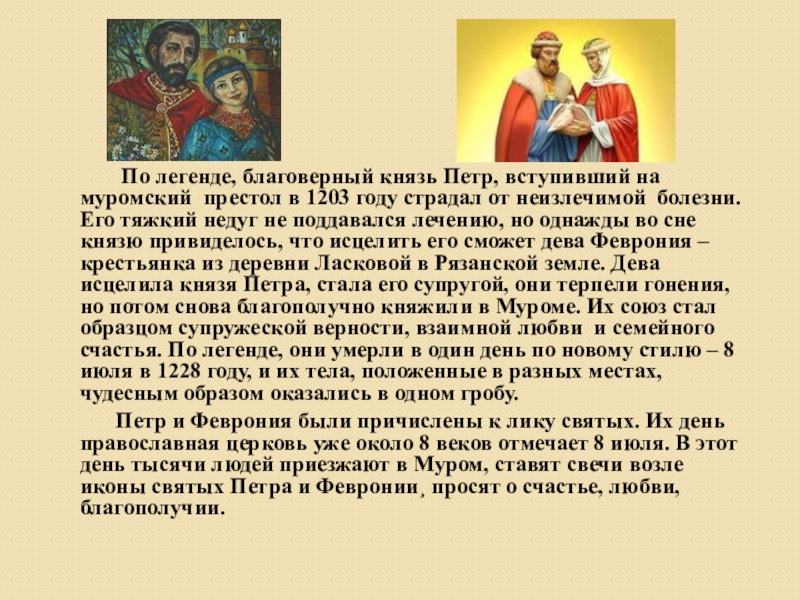 вступивший на муромский престол в 1203 году страдал от неизлечимой болезни. Его тяжкий недуг не поддавался лечению, но однажды во сне князю привиделось, что исцелить его сможет дева Феврония – крестьянка из деревни Ласковой в Рязанской земле. Дева исцелила князя Петра, стала его супругой, они терпели гонения, но потом снова благополучно княжили в Муроме. Их союз стал образцом супружеской верности, взаимной любви и семейного счастья. По легенде, они умерли в один день по новому стилю – 8 июля в 1228 году, и их тела, положенные в разных местах, чудесным образом оказались в одном гробу.