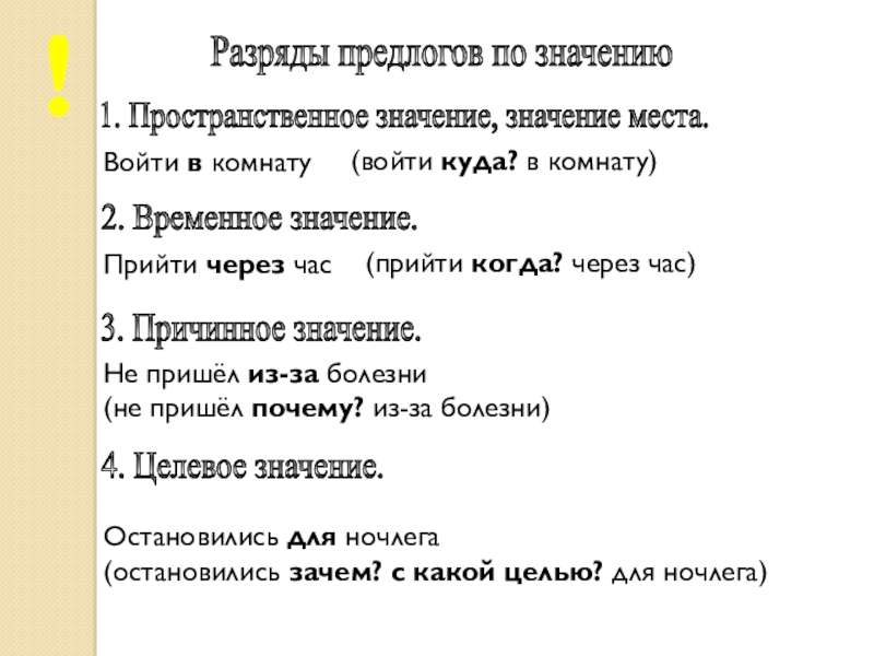 По значению делятся на предлоги с пространственным, временным, причинным и целевым значением.