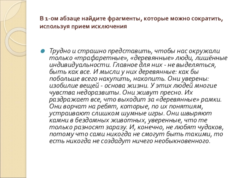 Слайд 8В 1-ом абзаце найдите фрагменты, которые можно сократить, используя прием исключения