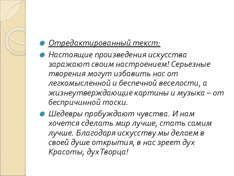 Б) Второе и третье предложения, содержащие конкретные примеры, должны быть заменены более общим по смыслу предложением: Серьезные произведения могут избавить нас от легкомысленной и беспечной веселости, а жизнеутверждающие картины и музыка – от беспричинной тоски.
