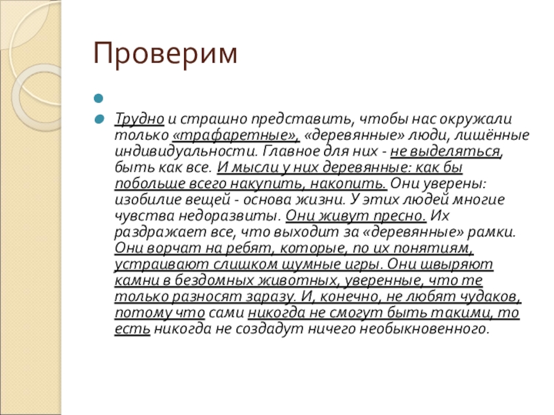 Трудно и страшно представить, чтобы нас окружали только «трафаретные», «деревянные» люди, лишённые индивидуальности. Главное для них - не выделяться, быть как все. И мысли у них деревянные: как бы побольше всего накупить, накопить. Они уверены: изобилие вещей - основа жизни. У этих людей многие чувства недоразвиты. Они живут пресно. Их раздражает все, что выходит за «деревянные» рамки. Они ворчат на ребят, которые, по их понятиям, устраивают слишком шумные игры. Они швыряют камни в бездомных животных, уверенные, что те только разносят заразу. И, конечно, не любят чудаков, потому что сами никогда не смогут быть такими, то есть никогда не создадут ничего необыкновенного.