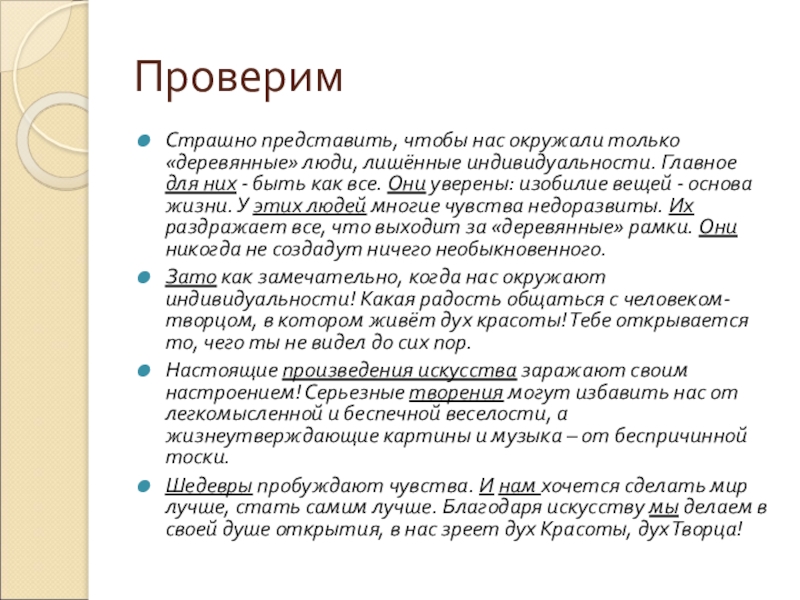 представить, чтобы нас окружали только «деревянные» люди, лишённые индивидуальности, так как чувства их недоразвиты и они никогда не создадут ничего необыкновенного.