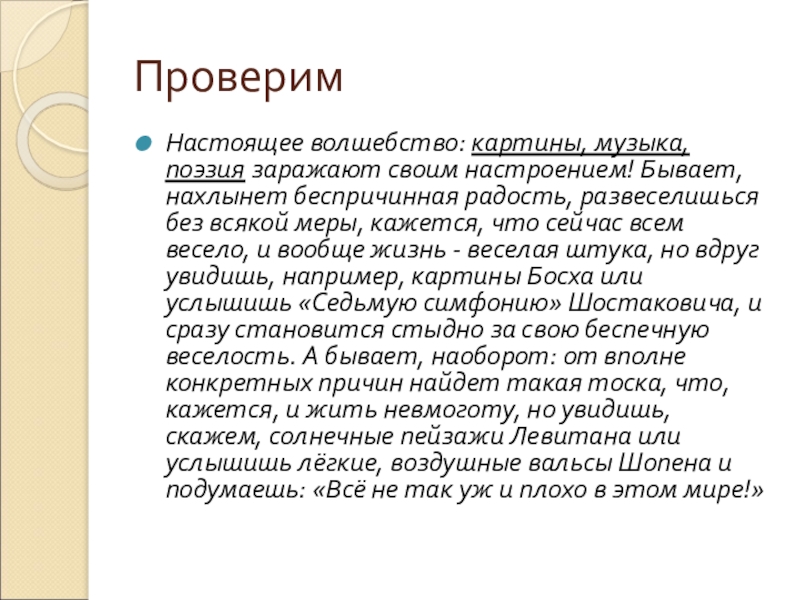 беспричинная радость, развеселишься без всякой меры, кажется, что сейчас всем весело, и вообще жизнь - веселая штука, но вдруг увидишь, например, картины Босха или услышишь «Седьмую симфонию» Шостаковича, и сразу становится стыдно за свою беспечную веселость. А бывает, наоборот: от вполне конкретных причин найдет такая тоска, что, кажется, и жить невмоготу, но увидишь, скажем, солнечные пейзажи Левитана или услышишь лёгкие, воздушные вальсы Шопена и подумаешь: «Всё не так уж и плохо в этом мире!»