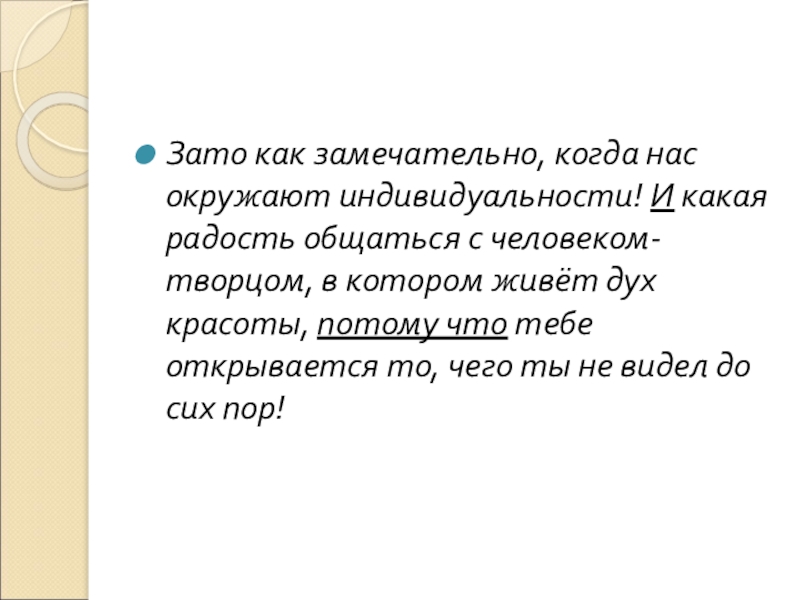 Зато как замечательно, когда нас окружают индивидуальности! Какая радость общаться с человеком-творцом, в котором живёт дух красоты! Тебе открывается то, чего ты не видел до сих пор.
