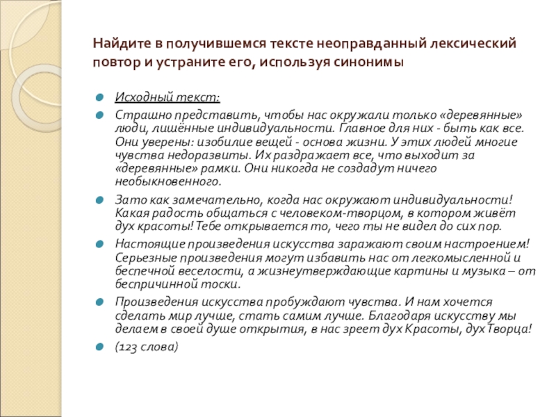 Слайд 18Найдите в получившемся тексте неоправданный лексический повтор и устраните его, используя